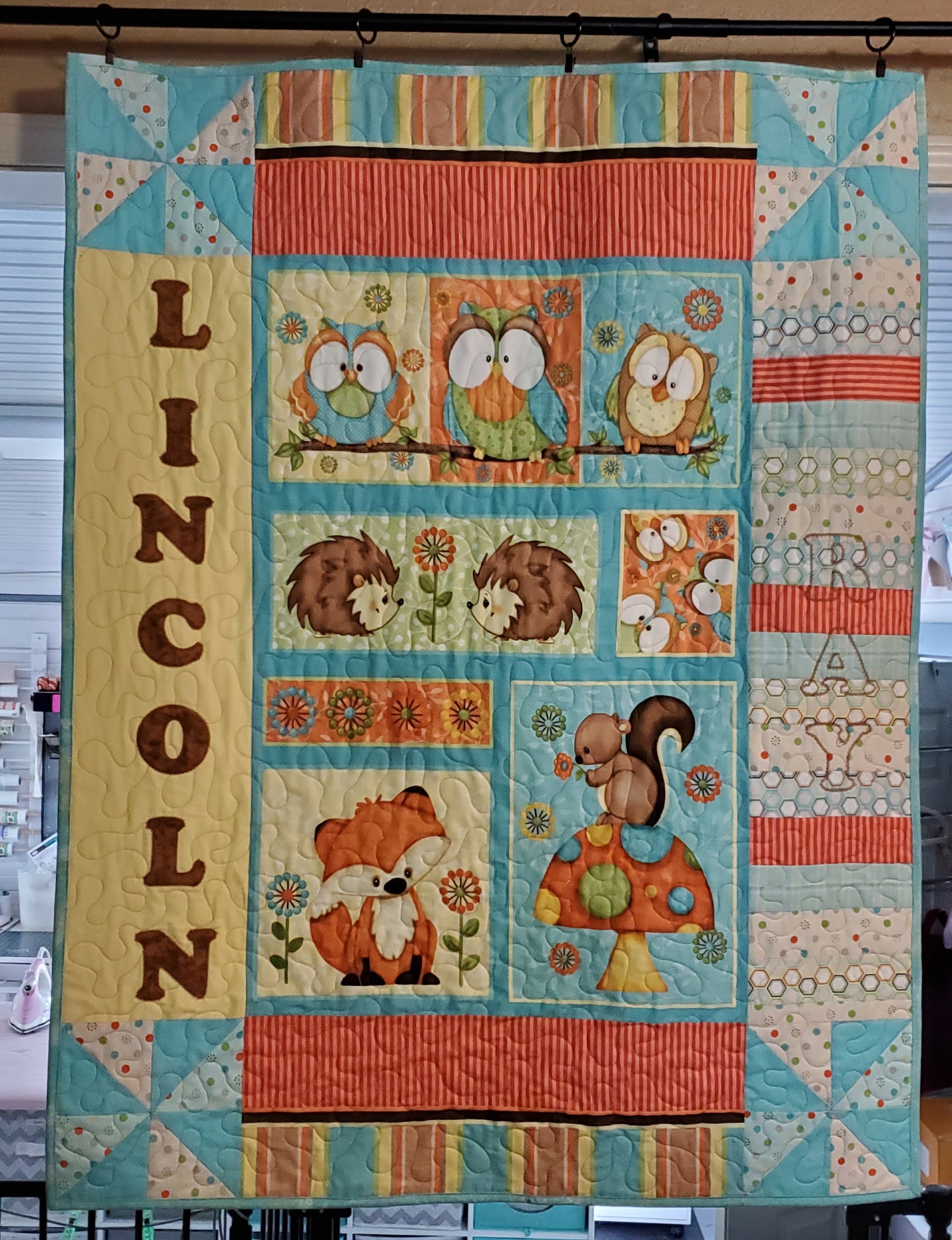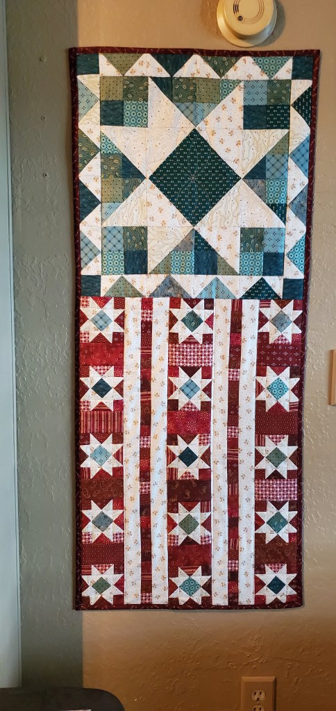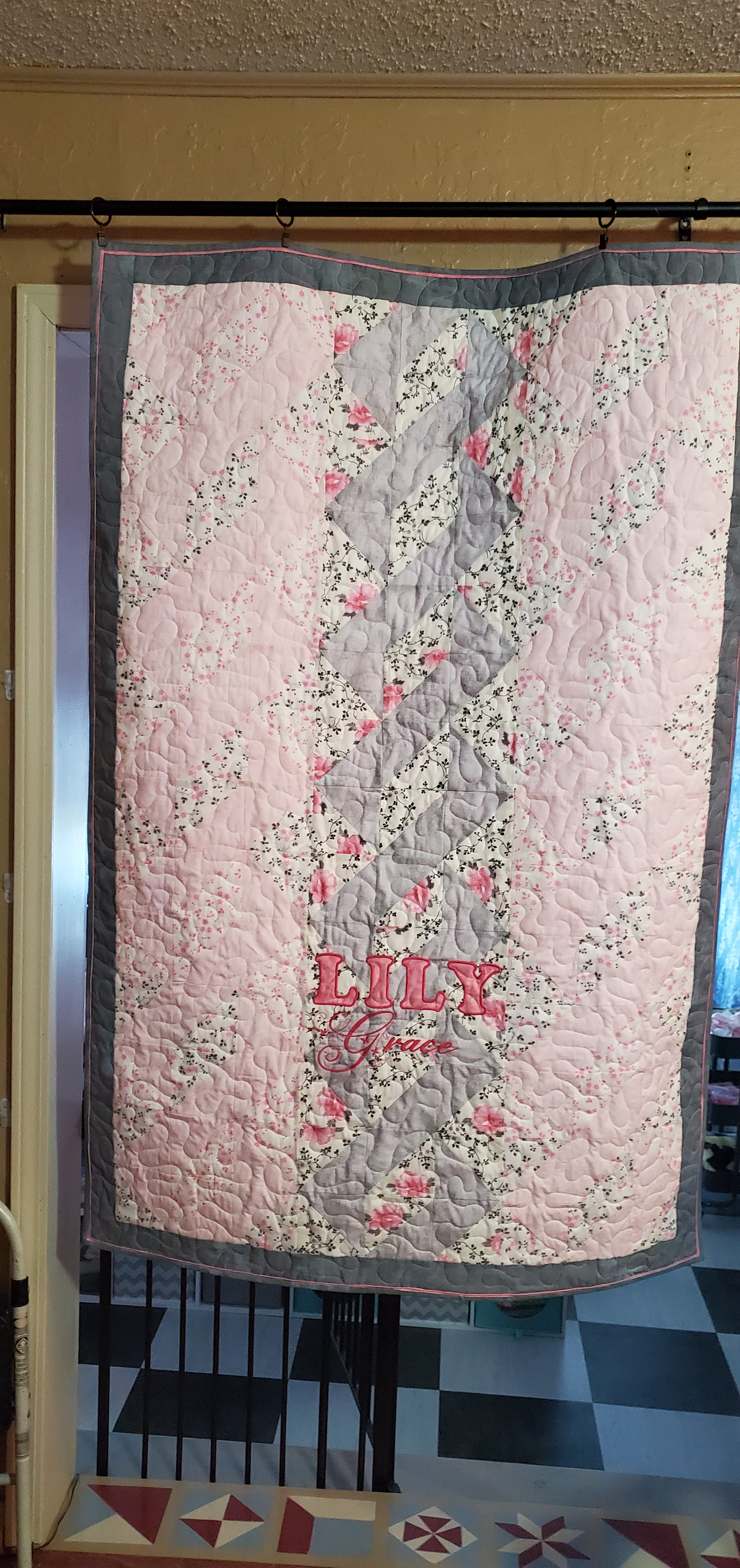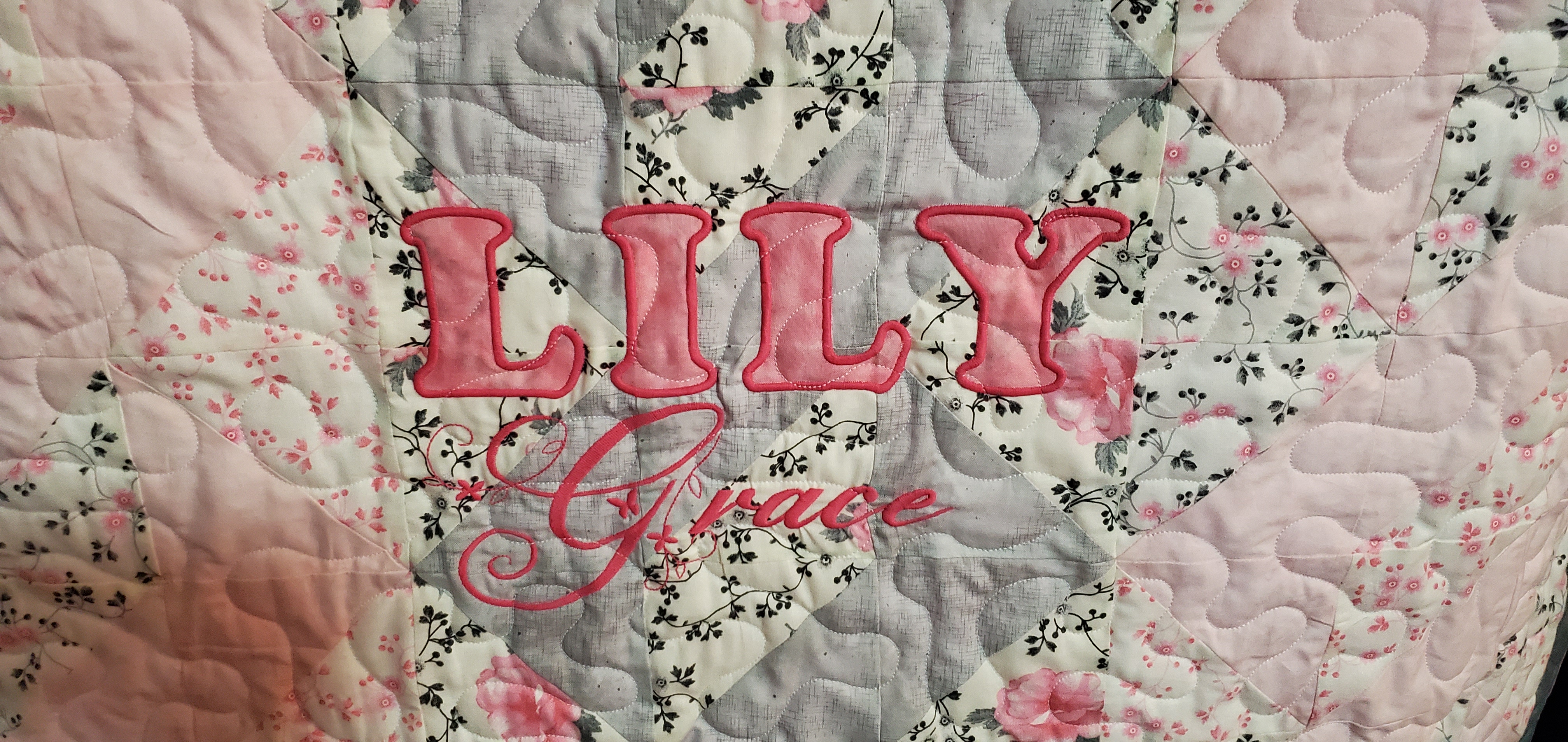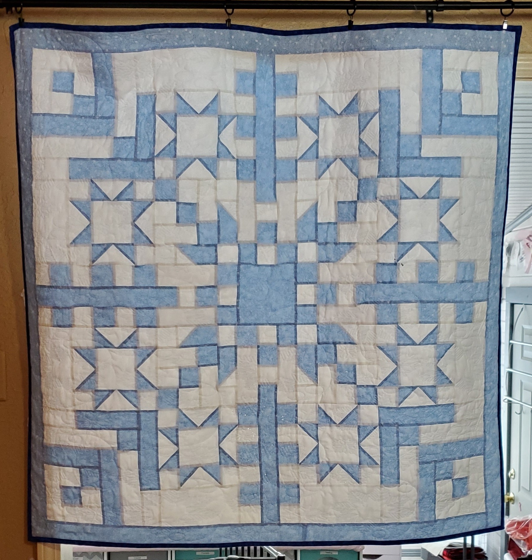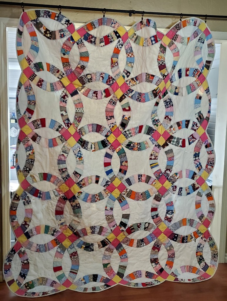 I quilted this top for Shiela Gowen. My brother recently married his high school sweetheart. Only 40 years later. She had this top from her grandmother. It was hand stitched I am guessing around 1950 to 1960. I machine quilted it for her. It had some stains and was not too flat, but I think it turned out ok. At least it will last her a little while longer.
